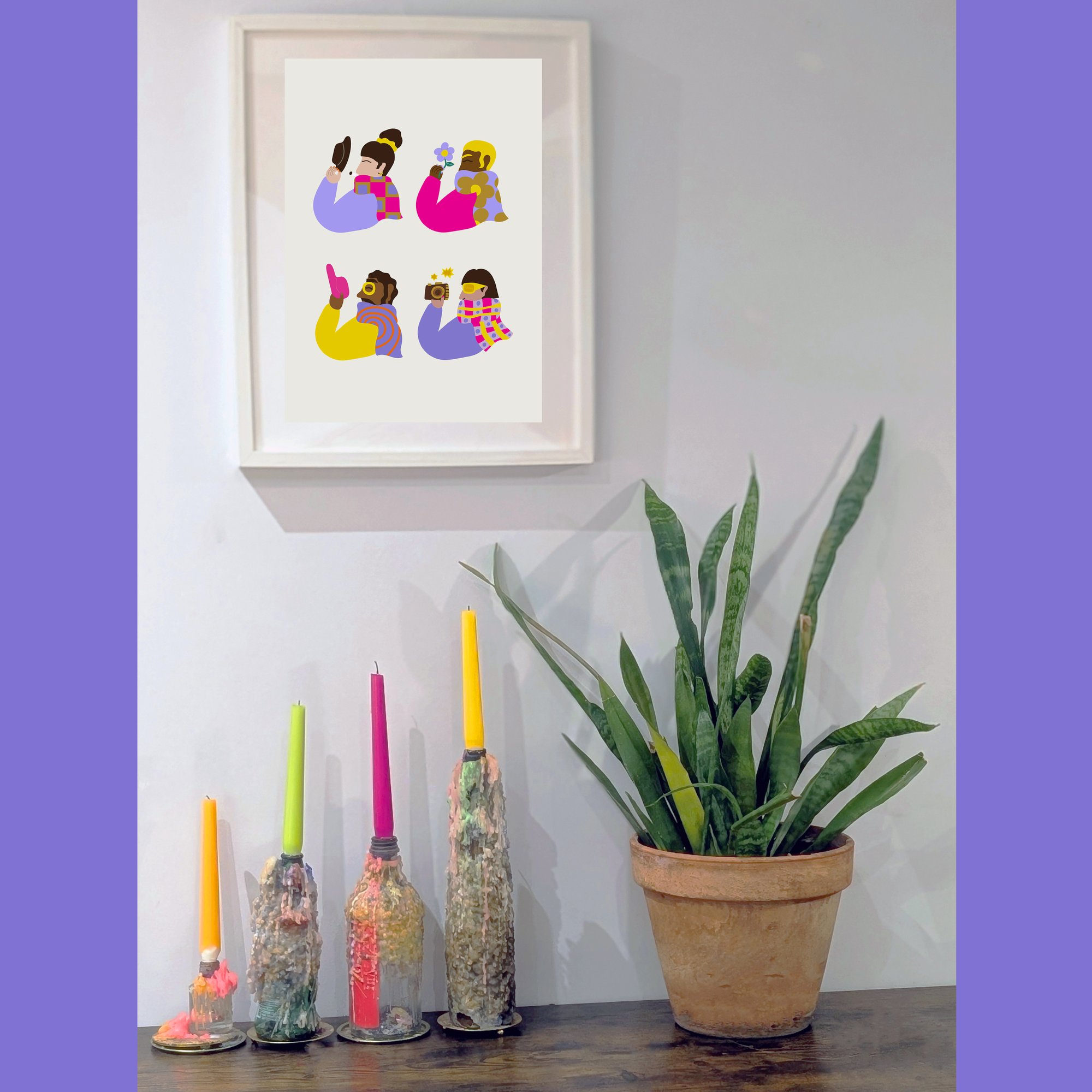 Unframed high quality giclée art print, sized A4, rapped in biodegradable wrapping and posted in a hard backed A4 envelope.